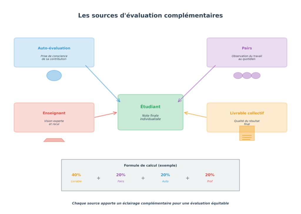 La solution la plus efficace, c’est l’évaluation par les pairs. Qui mieux que les membres du groupe peut témoigner de l’implication réelle de chacun ? Ils ont vécu l’expérience de l’intérieur, ils savent qui était là, qui a pris des initiatives, qui a respecté les délais.