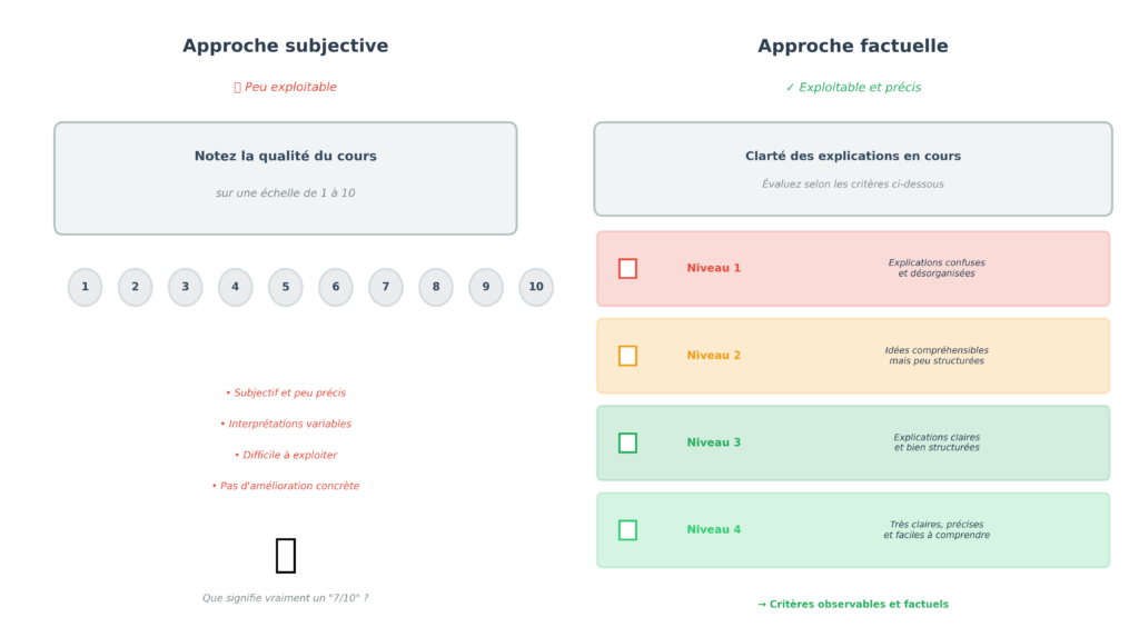 L’approche qui marche, c’est de s’appuyer sur des éléments observables, des faits tangibles. Par exemple, plutôt que « Notez la clarté de l’enseignant », on peut proposer une échelle descriptive à quatre niveaux. Le premier niveau pourrait être « Les explications sont confuses et désorganisées, la compréhension est difficile », puis « Les idées sont globalement compréhensibles mais parfois mal exprimées ou peu structurées », ensuite « Les explications sont claires et bien structurées dans l’ensemble », et enfin « Les explications sont très claires, précises et permettent une compréhension facile des notions ». Vous voyez la différence ? L’étudiant se base sur du factuel, pas sur une impression générale.